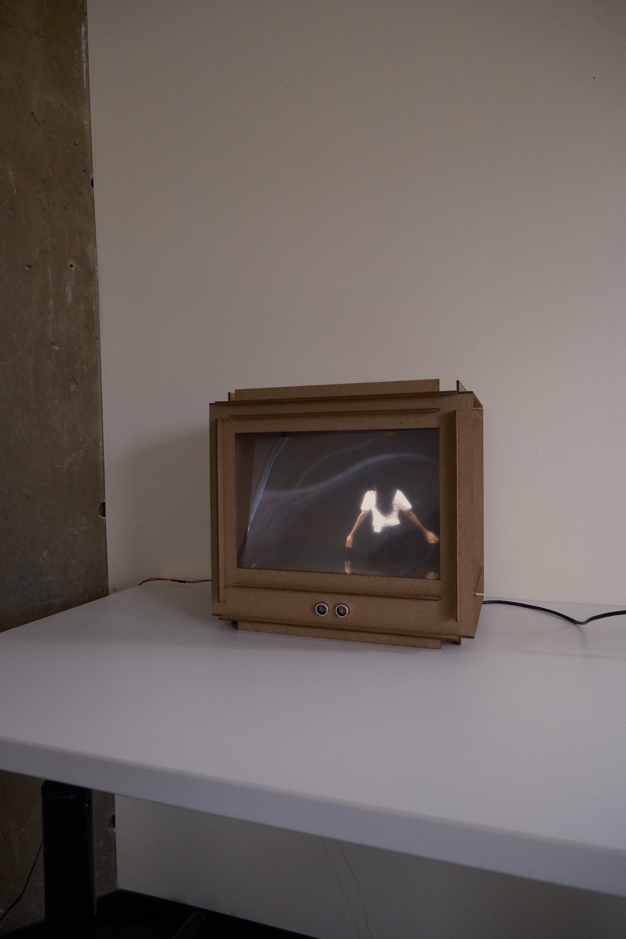 This box holds a “Ghost in the Machine”, a digital consciousness that lives inside the TV. She sometimes looks like she is trapped and trying to get out, sometimes bored, and sometimes curious.