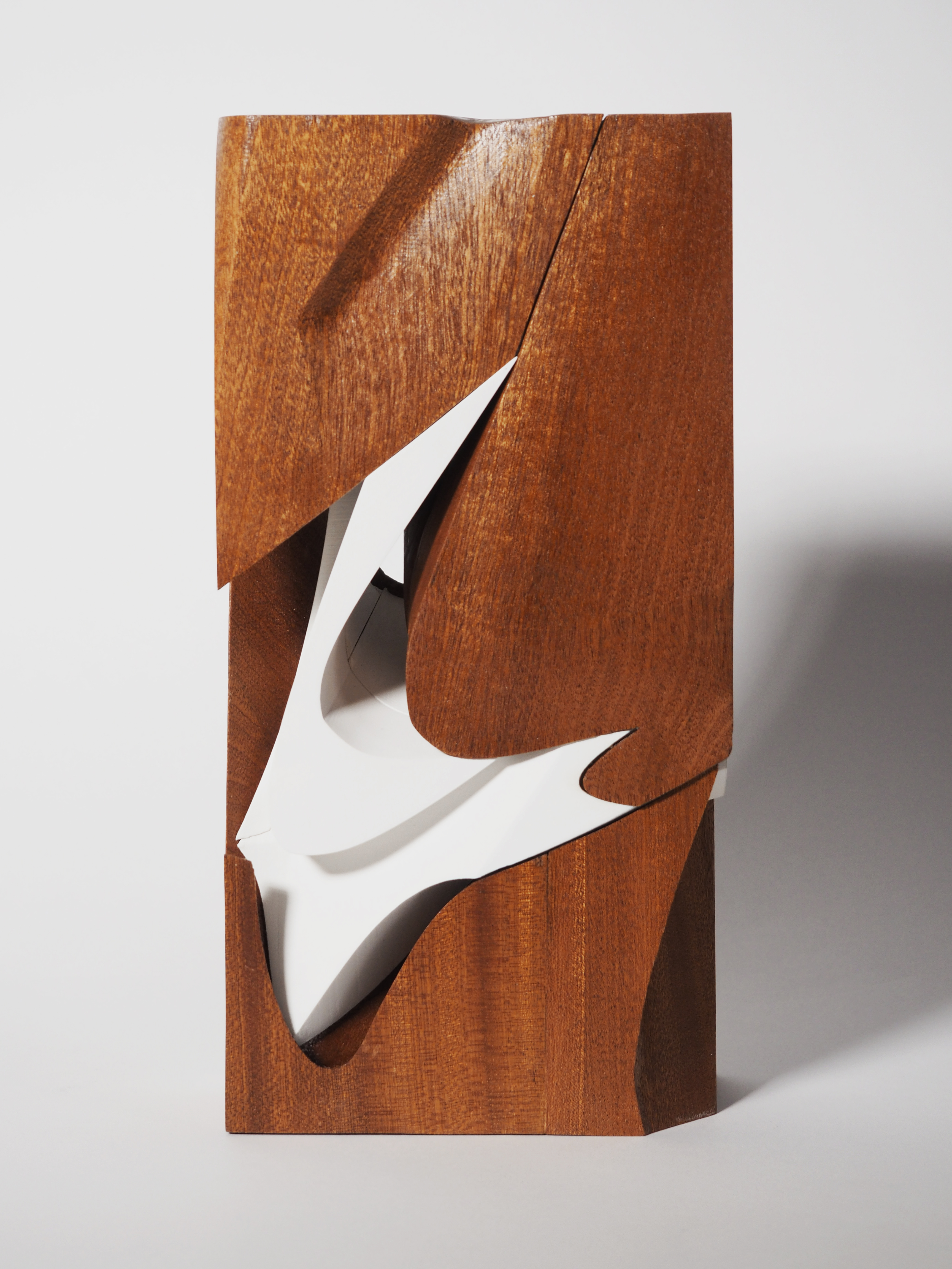 This “active inlay model” is a study of excavation - where the white “inlay” piece replaces what was previously the core of the “host” wood chunk. The inlay, then, extends out from this core to three faces of the box, extending from a curvilinear core to prismatic geometry at the ends.